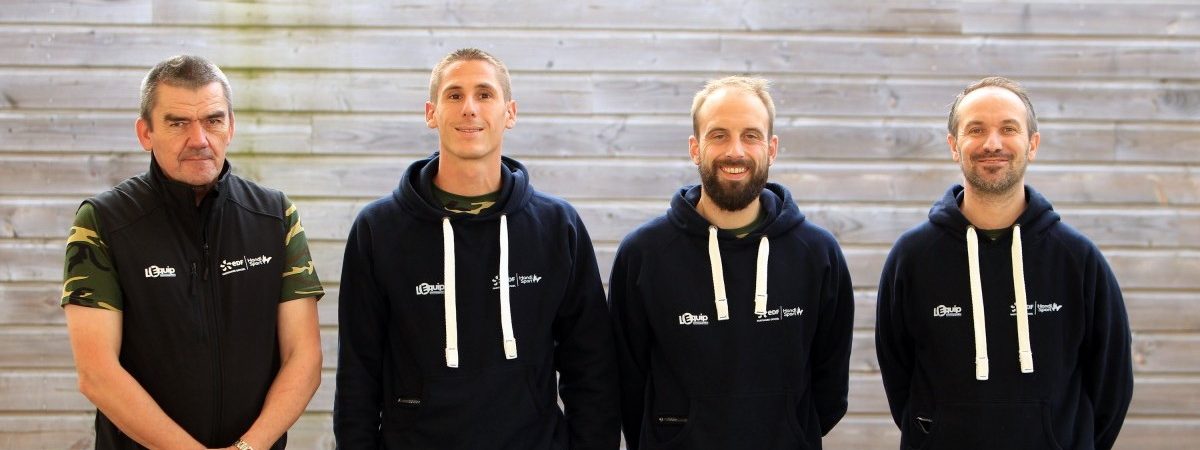 © G. Picout. L’équipe du Pôle France Handibasket avec, de g. à dr. : Yannick Caroff (mécanicien), Antoine Vitrant (manager de l’Equipe de France espoirs), Stéphane Binot (entraîneur du Pôle France) et Antony Joubert.