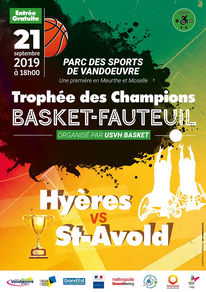 Le Trophée des Champions 2019 de basket fauteuil aura lieu le samedi 21 septembre à 18h, et se jouera entre l’équipe de Hyères (Champion de France Nationale A) et Saint Avold (finaliste de la Coupe de France Trophée Maurice Schoenacker) !