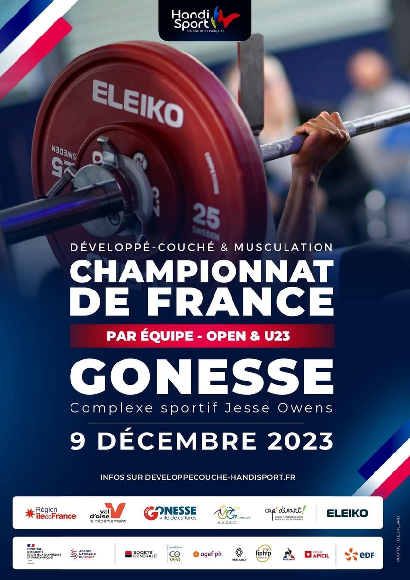 Le championnat de France de développé couché et musculation handisport aura lieu le samedi 9 décembre 2023 de 10h à 18h, au complexe sportif Jesse Owens à Gonesse !